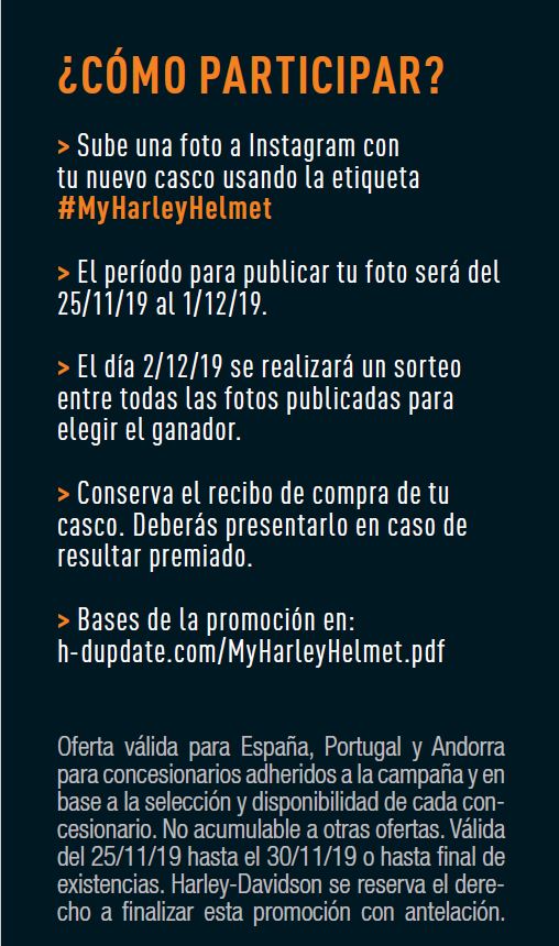 con tu nuevo casco y la subes a Instagram con el siguiente hashtag: #MyHarleyHelmet. El periodo para publicar tu foto es del 25 de noviembre al 1 de diciembre de 2019. El día 2 de diciembre Harley-Davidson España realizará el sorteo entre todas las fotos publicadas para elegir al ganador. Conserva el recibo de compra de tu casco ya que en caso de resultar premiado deberás presentarlo