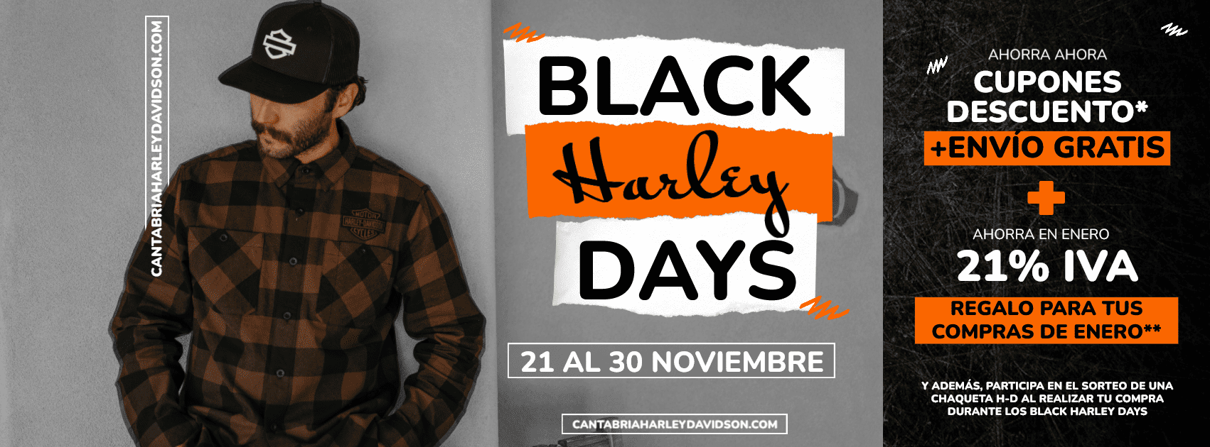 Del 21 al 30 de noviembre, aprovecha los cupones descuento Black Friday de hasta 40 euros, envío gratis en todos los pedidos y te regalamos el 21% de IVA para tus compras de enero. Además, con tu compra, ¡participas en el sorteo de una chaqueta H-D!