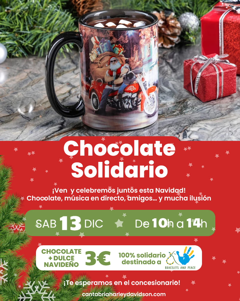 En Cantabria Harley-Davidson os animamos a participar en nuestro Chocolate Solidario, que celebraremos el sábado 13 de diciembre, de 10:00 a 14:00, en nuestras instalaciones del Parque Empresarial Tirso González, Local 19, Astillero, Cantabria.