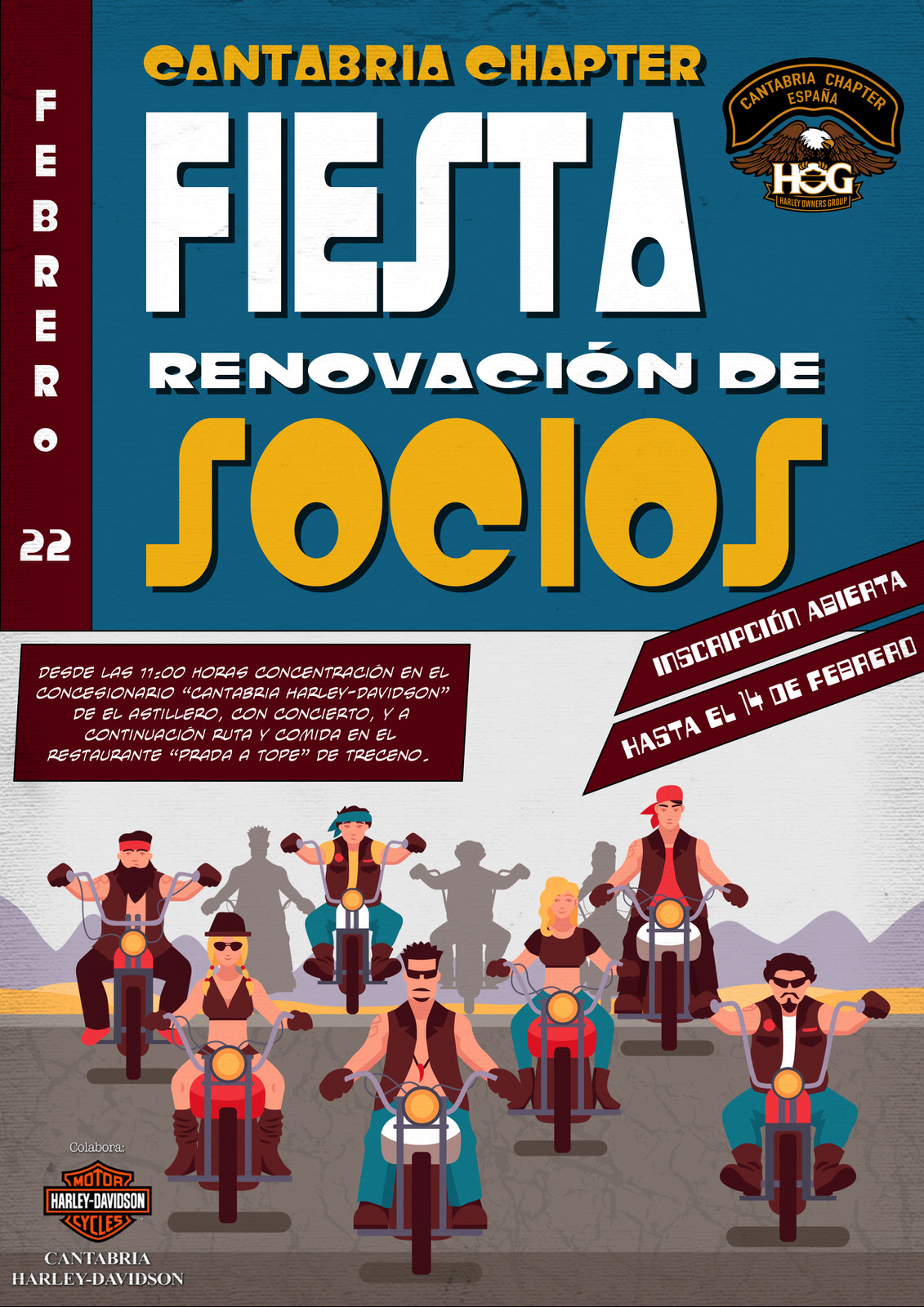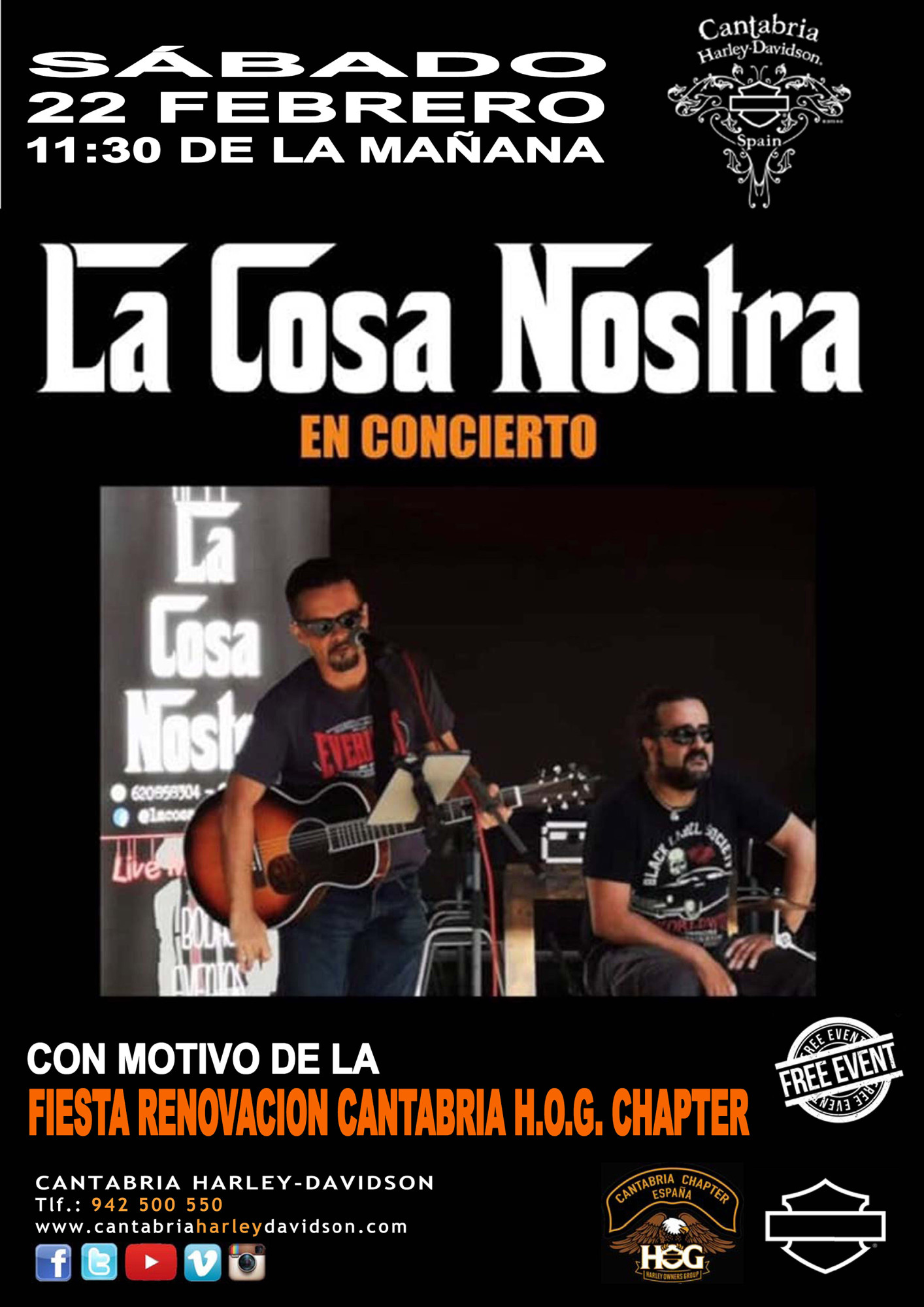 Nuestras Puertas Abiertas TRUE ORIGINALS culminan el sábado 22 de febrero con la FIESTA DE RENOVACION DE SOCIOS del Cantabria HOG Chapter. Baila y canta al ritmo del duo músical La Cosa Nostra y degusta un aperitivo que ofreceremos a todos los asistentes