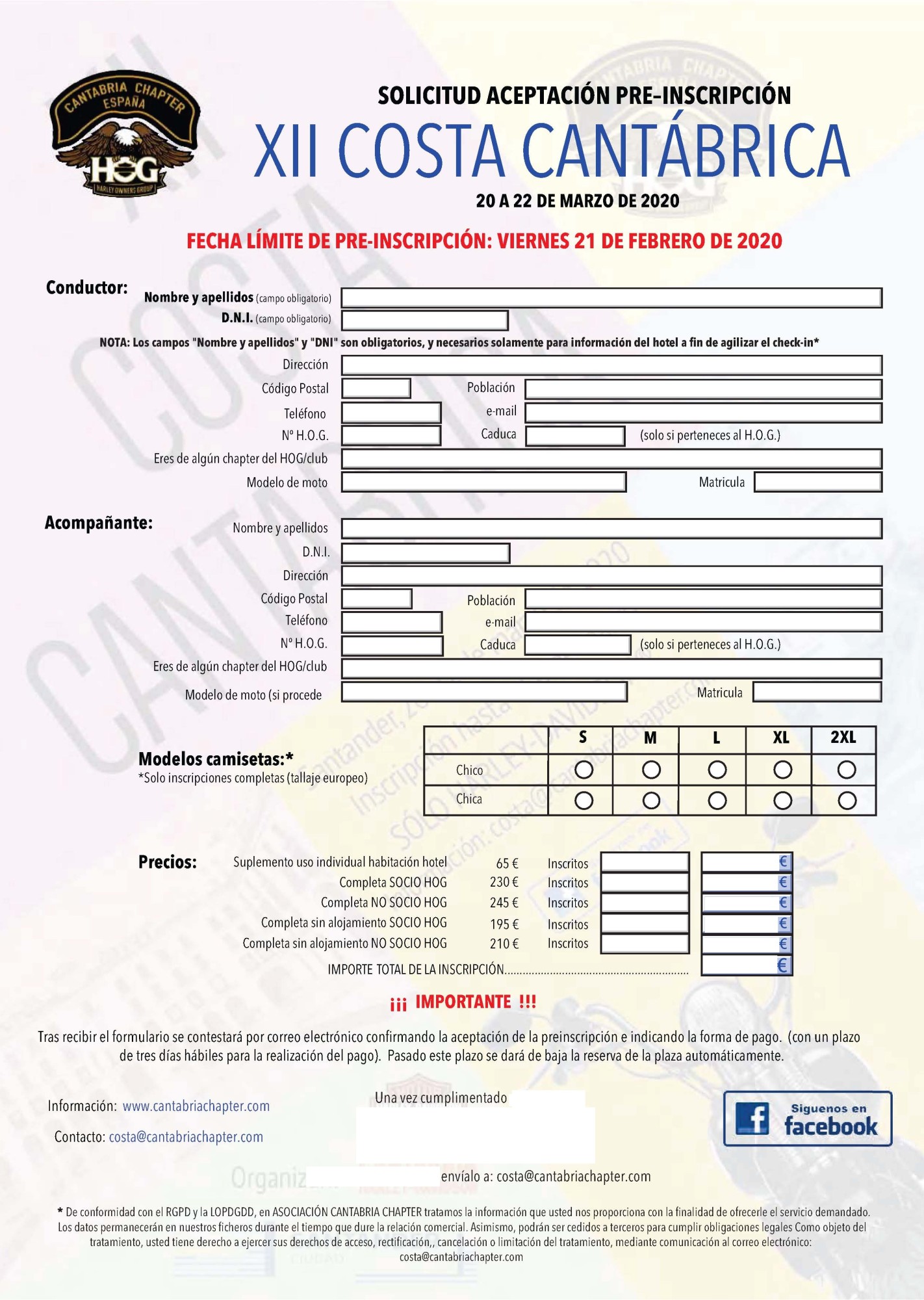 Consultas a través del mail info@cantabriachapter.com o por mensaje privado de Facebook de Cantabria H.O.G. Chapter