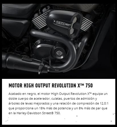 Acabado en negro, el motor Revolution X viene dotado con un módulo de inducción de doble cuerpo, además de culatas y árboles de levas mejorados en relación al modelo XG750. Esto junto con una compresión de 12,0:1 que proporciona un 18% más de potencia y un 8% más de par motor que el modelo Harley-Davidson
