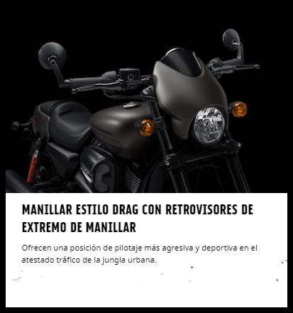 Tus manos reposan sobre una manillar estilo Drag para una posición más agresiva y con los retrovisores en el extremo del manillar, lo que permite una mejor visión y le de ese aire racer