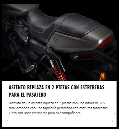 La Harley-Davidson Street Rod está pensada para escapas en solitario o en compañía gracias al asiento biplaza de 2 plazas, acabado en tapicería perforada con costuras francesas junto con unas estriberas de pasajero