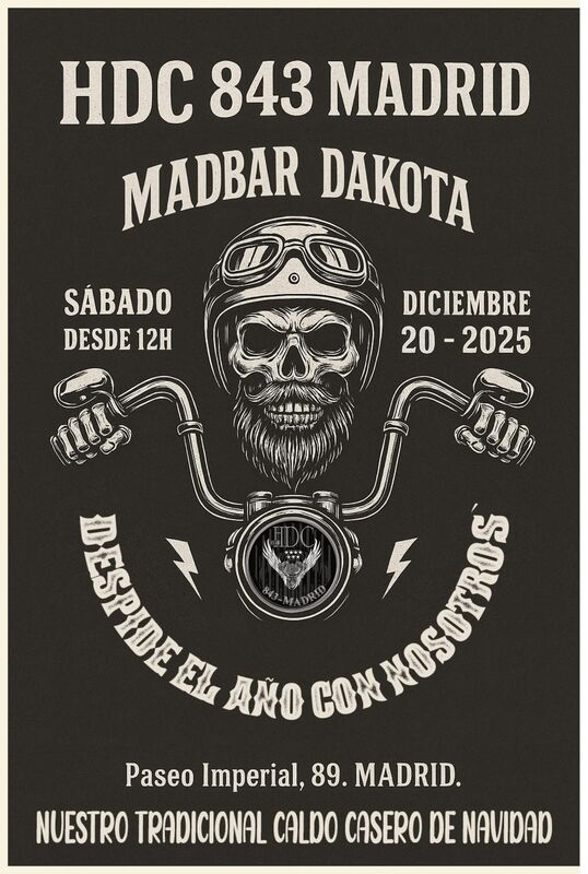 Despide el año de la mejor manera con la el HDC 843 Madrid en el Dakota Custom Bar. Sábado 20 de diciembre, desde las 12.00h , con el tradicional caldo casero y barril de cerveza. ¡No te lo pierdas!