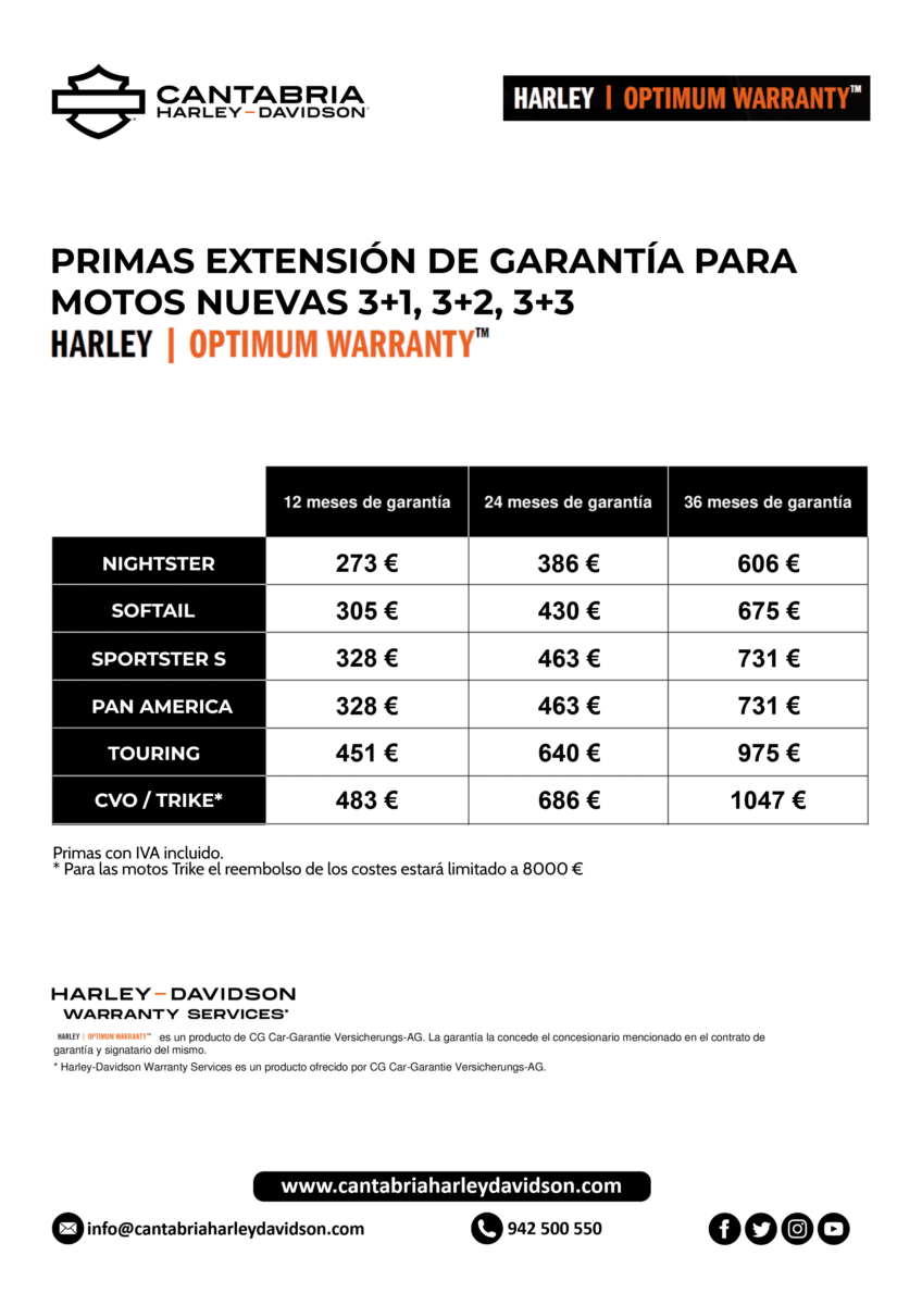 La HARLEY OPTIMUM WARRANTY es una inversión que te puede salir muy rentable a largo plazo ya que por la extensión de garantía por ejemplo de 12 meses para una Nightster solo cuesta 273 euros. ¡Con esto cubres las averías de TODO UN AÑO! Más información en el Telf. . 942 500 550 ó enviando un mensaje a través de la sección «contacta» del menú inicio de esta Web. *(Valida para toda la Unión Europea, Suiza y Noruega).