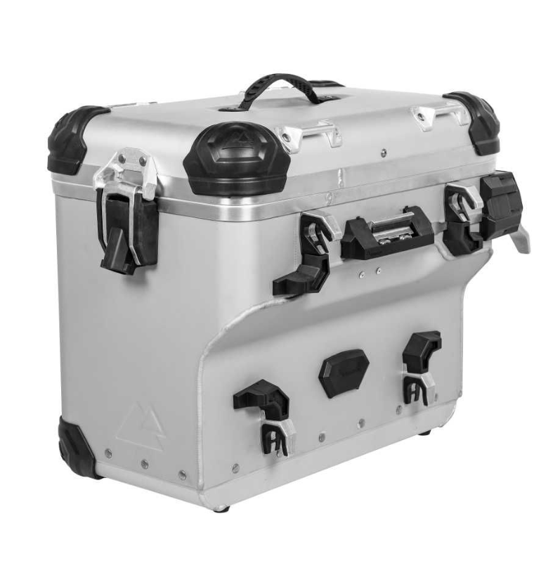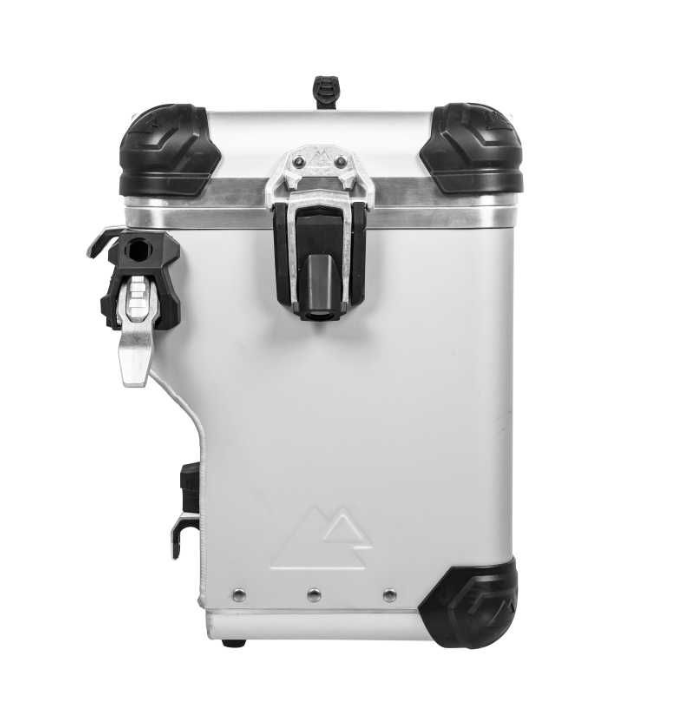 La maleta ZEGA Evo X de 45 litros combina la reconocida robustez del aluminio Touratech con un manejo más cómodo y práctico, gracias a su nuevo sistema de fijación EVO X. El sistema especial EVO X destaca por el recorte en la maleta derecha, diseñado para adaptarse perfectamente al escape. Gracias a ello, las maletas quedan más cerca del centro de la moto, reduciendo el ancho total y logrando un conjunto más equilibrado y armonioso con tapas simétricas.