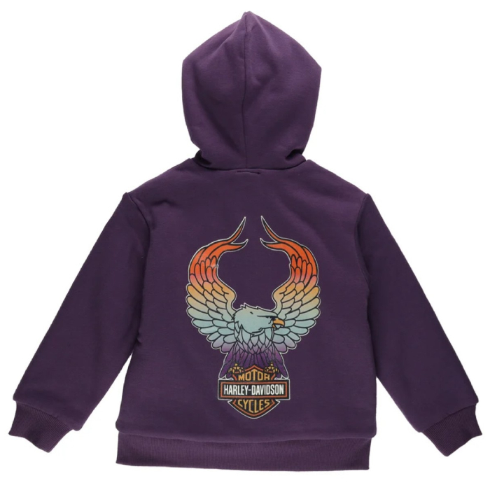 Chaqueta con capucha y forro sherpa Harley-Davidson® Bar & Shield para niña. La chaqueta con capucha forrada de Sherpa presenta un parche tejido Bar & Shield en la parte delantera y un águila HD® brillante en la espalda.
