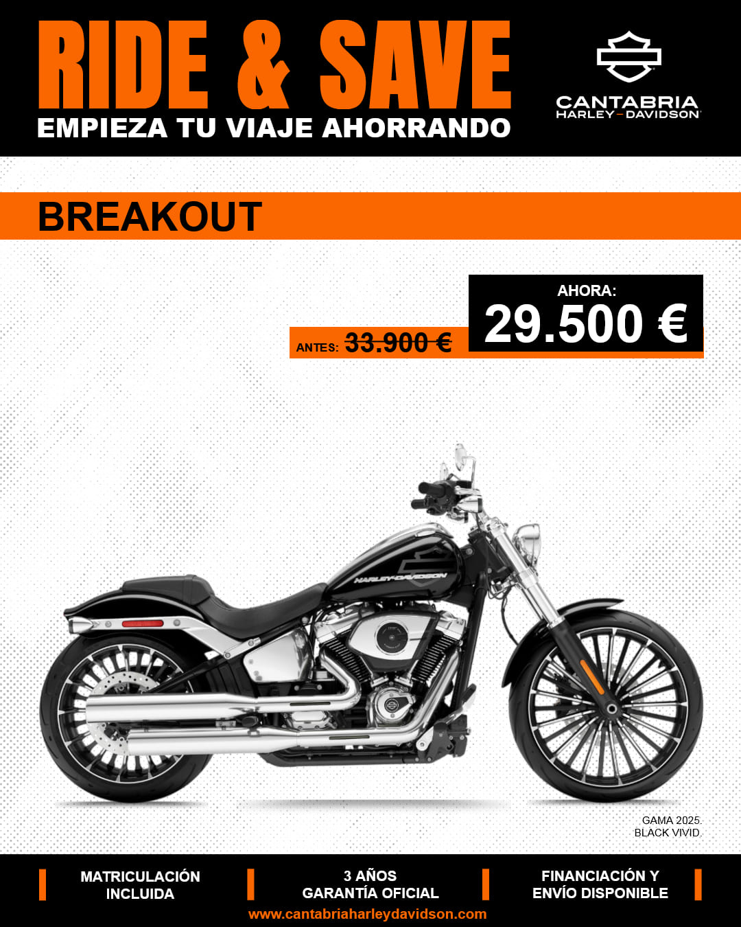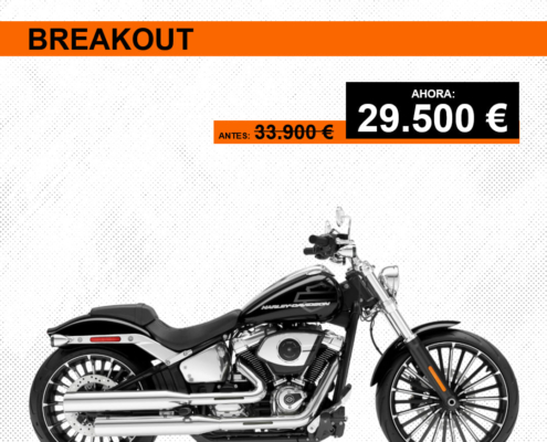 La Breakout combina el espíritu cruiser con un diseño impactante y potencia a raudales. Su precio original es de 33.900 €, y durante la campaña se ofrece a 29.500 €, ahorrando 4.400 €. Además, es compatible con la promoción especial de 2.500 € en vale regalo para piezas y accesorios Harley-Davidson. Incluye matriculación, 3 años de garantía oficial, opciones de financiación y envío disponible.