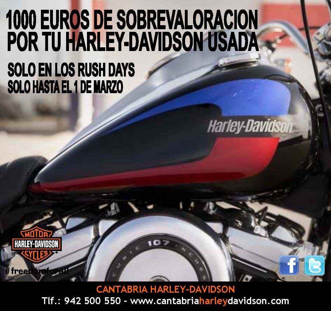 HARLEY-DAVIDSON, cambia el sofá por las mejores ofertas sobre dos ruedas y nuestra boutique Harley. Los 10 días de los RUSH DAYS hasta el 1 de marzo marcaran el comienzo de la temporada 2019. Estate atento a las ofertas especiales que lanzaremos durante los días de los RUSH DAYS, súbete a tu moto, acelera y disfruta, las curvas te lo agradecerán.